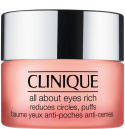Clinique All About Eyes Rich Eye Cream er en yderst fugtgivende øjencreme, som effektivt modvirker trætte, hævede øjne. Øjencremen er udviklet med en rig formel, som beroliger huden med intense mængder fugt. Samtidig styrker den også hudens fugtbarriere, så den bliver mere modstandsdygtig overfor daglige påvirkninger. Denne øjencreme hjælper ligeledes med at reducere synligheden af poser, skygger og mørke rande under øjnene, samt fine linjer, og du vil opleve en effekt både øjeblikkeligt, men også over tid.