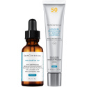 SkinCeuticals Phloretin CF repræsenterer en ny kategori indenfor den forebyggende og korrigerende antioxidantpleje. For at modvirke de frie radikalers negative påvirkninger på huden har SkinCeuticals efter fem års omfattande forskning udviklet denne patentsøgte, banebrydende formel som kombinerer phloretin med C-vitamin og ferulinsyre. Serummet hjælper med at reducere pigmentforandringer for en mere jævn og strålende hudtone. Phloretin CF er en bredspektrumsbehandling, der styrker huden og beskytter mod frie radikaler. Resultatet er en hud, der ser mere fast og ungdommelig ud. Advanced Brightening UV Defense SPF50 er en bredspektret UV-beskyttelse, der hjælper med at modvirke pigmentering. Den har en let formel, der indeholder 1% tranexamsyre og 2% niacinamid, som hjælper med at udjævne hudtonen og minimere synligheden af pigmentering. Påføres hver morgen for at beskytte huden mod UV-stråler.