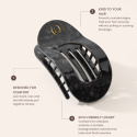 Lenoites Flat Hair Clip er en elegant hårklemme fremstillet af miljøvenligt celluloseacetat, et eksklusivt og holdbart materiale, der føles let, stærkt og luksuriøst. Det ergonomiske design følger hovedets form og giver et sikkert greb hele dagen uden at slide på håret.