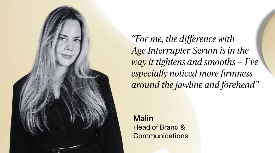 ”Forskellen med A.G.E. Interrupter Ultra Serum er, hvordan den strammer op og udjævner – jeg har især bemærket effekt omkring kæbelinje og pande. Med kombineret hud blev jeg imponeret over, hvor let og fløjlsblød formlen føles, men stadig effektiv, og den giver synlig fasthed uden at føles tung eller fed.” – Malin, Head of Brand hos Bangerhead