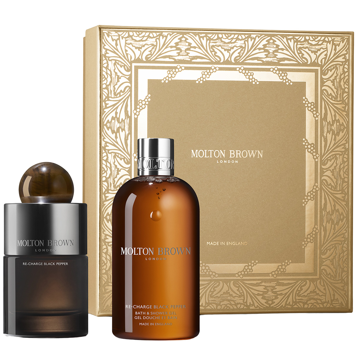 Re-charge Black Pepper Fragrance Gift Set fra Molton Brown er den længe ventede duo for alle duftelskere. Sættet indeholder en duft og en brusegel med den ikoniske Re-charge Black Pepper-duft – en kraftfuld kombination af sort peber, koriander og vetiver. En sofistikeret totrinsrutine som passer perfekt ind i en velduftende hverdag. Spray duften på efter badet for en langvarig, karakterfuld duft.