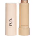 Vrid staven op, og påfør den på udvalgte områder, hvor du ønsker ekstra glans, f.eks. kindben, brynben og næsetip. Arbejd produktet ind med fingerspidserne eller en blød børste for at få en blød finish. Byg op, hvis det ønskes