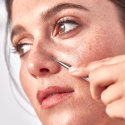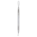 Hudplejeværktøj med en tynd vinklet løkke til forsigtigt at presse større hvide hudorme ud, og en fladere, aflang løkke til at presse mindre mørke hudorme ud.